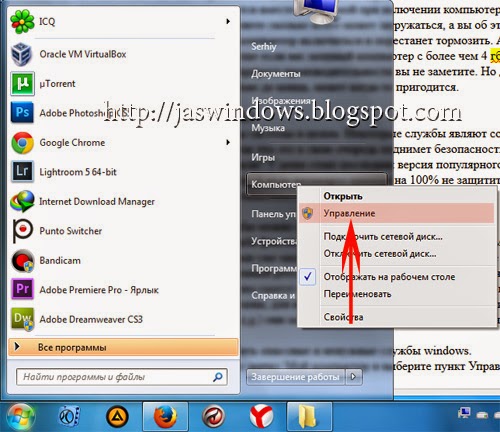 1. Нажмите правой кнопкой по значку Компьютер и выберите пункт Управление. В windows 8 то же самое, только нажимать нужно по ярлыку Компьютер на рабочем столе.
