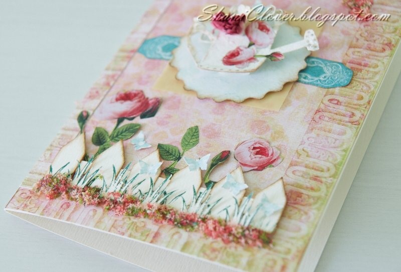 Второй пример - создание открытки с объёмными элементами с помощью штампа и цветочного моха. Всё достаточно просто - на отпечаток напосится клей, посыпается цветочным мохом, после чего остатки цветочного моха стряхиваются с поверхности.
