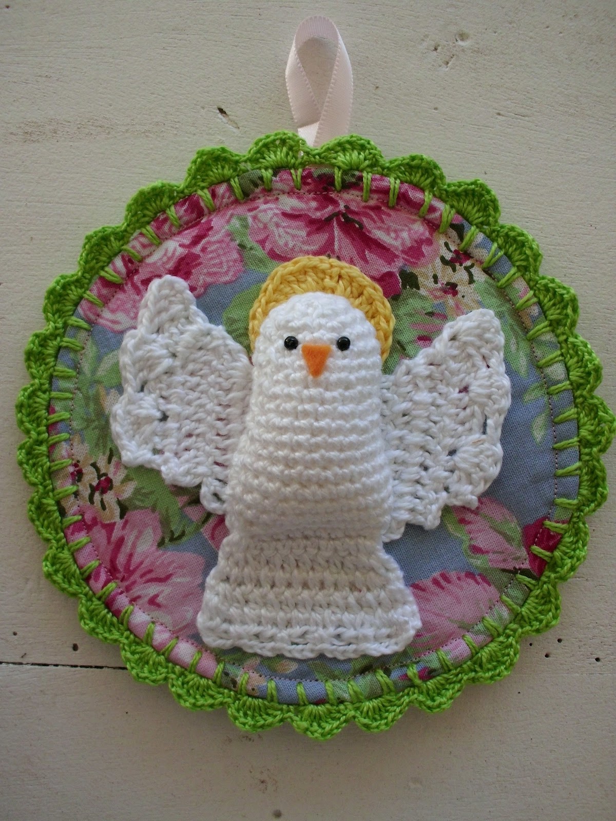 Круг назад за формы, размером с КОМПАКТ-диск. Резки 2x в ткани и 1x в плед акриловый. Лента для подвешивания есть 10 см. Пришейте на фирменное наименование и резки с места 0,5см. Сделайте надрез в середине одной из сторон ткани и desvire.Faça в морщить вверх крючком. Вставьте голубь, в верхней части разреза. Глазки два бусинками и морщить вверх сделан из войлока.