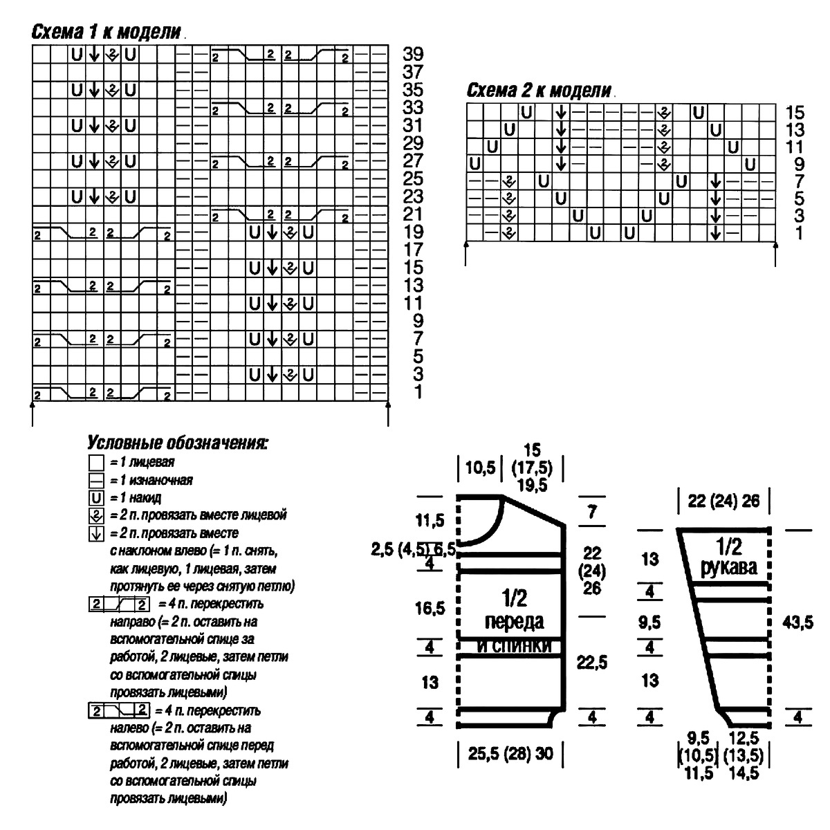 Через 4 см от набора петель закрыть петли по рисунку. Вшить рукава. Выполнить швы рукавов и боковые швы.