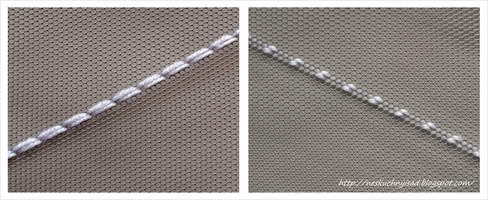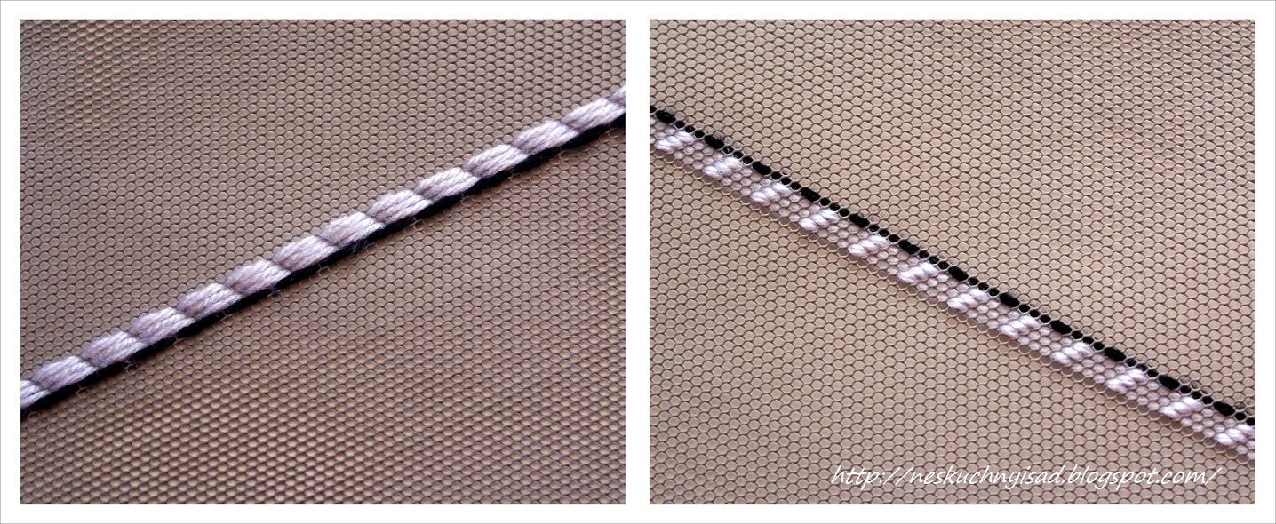 Для начала разберёмся, чем москитная сетка отличается от пластиковой канвы для вышивания. Во-первых: в сетке ряды дырочек-ячеек расположены не под прямым углом друг к другу, т.е. мы не можем разбить кусок сетки на привычные квадраты 10х10; во-вторых: направление вышивки всегда будет идти по диагонали, от угла. На фото зелёной стрелочкой показано направление движения и красным - ромб 5 на 5 ячеек.