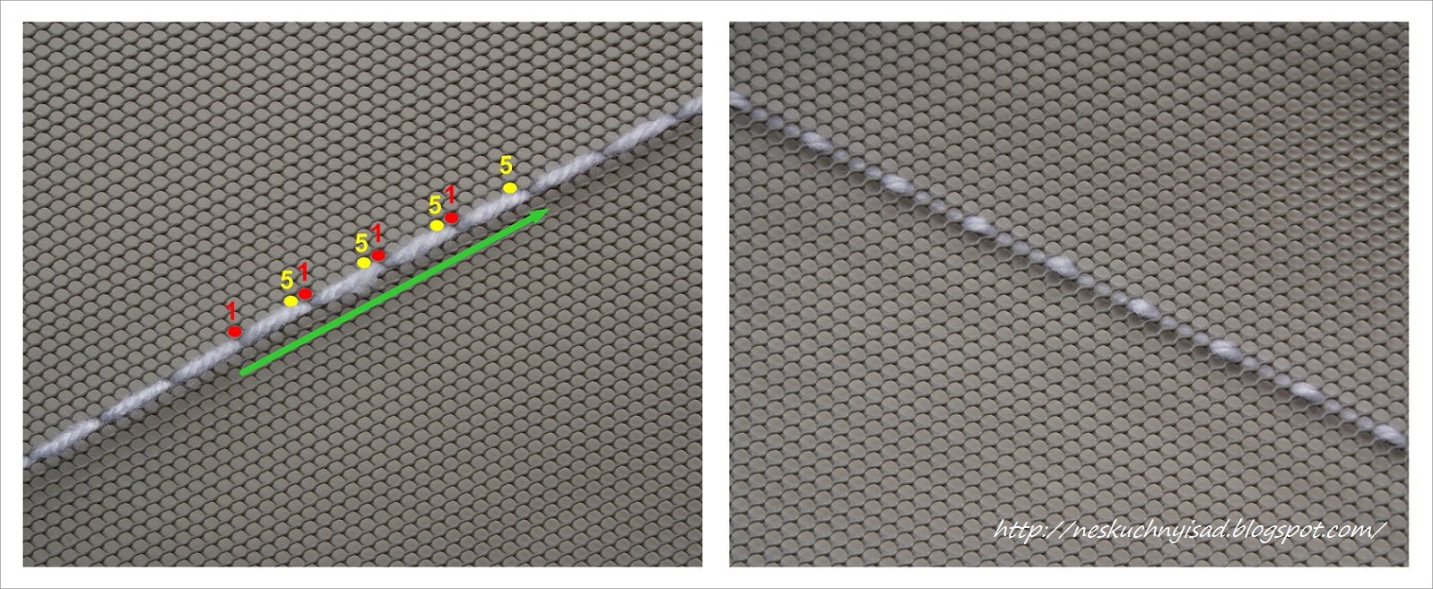 Подбираем пряжу (пригодятся остатки по 20-30 гр.), я для наглядности буду пользоваться нитями белого и чёрного цвета. Вдеваем белую нить в иглу (я пользуюсь гобеленовой большого размера). От нижнего левого угла начинаем двигаться вверх по диагонали: красной цифрой 1 на фото я обозначила место выхода иглы с изнаночной на лицевую сторону, пропускаем 3 ячейки, на 5-ой желтой - выводим иглу вниз на изнанку, далее повторяем движение вдоль зелёной стрелки. На снимках ниже: слева - лицо, справа - изнанка.