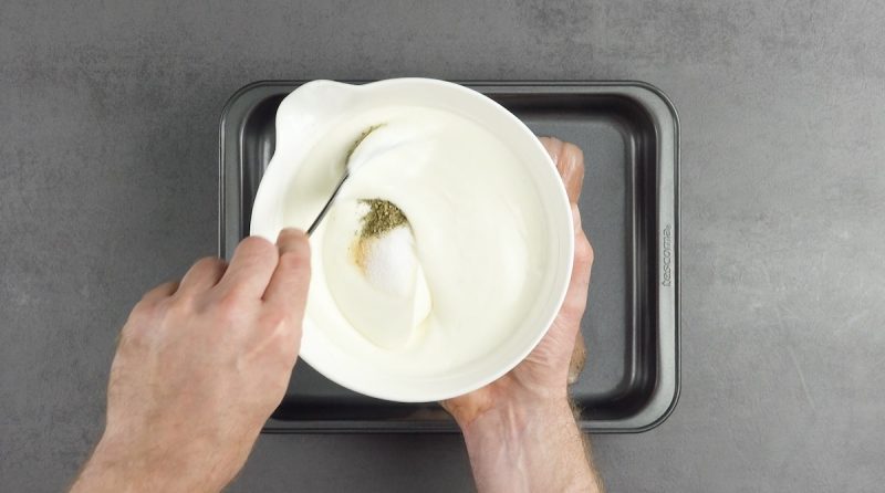 3.) Смешиваем йогурт с приправами и сахаром, чтобы получился густой и ароматный маринад.