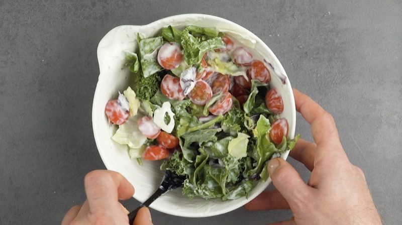 Совет: Чтобы йогурт не пропадал, крошим в миску с остатками маринада овощи для салата и перемешиваем. Гарнир готов!