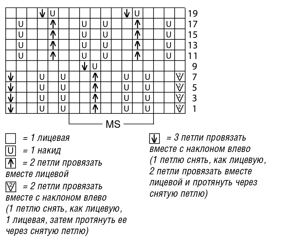 Число петель кратно 8 + 1 + 2 кромочные = вязать согл. схеме. На ней даны лицевые ряды. В изнаночных рядах все петли и накиды провязывать изнаночными. Начать с 1 кромочной и петель перед раппортом, раппорт постоянно повторять, закончить петлями после раппорта и 1 кромочной. Выполнить 1 раз 1–20-й ряды, затем повторить еще 1 раз 1–10-й ряды = всего 30 рядов.