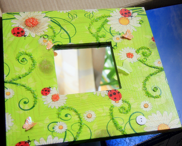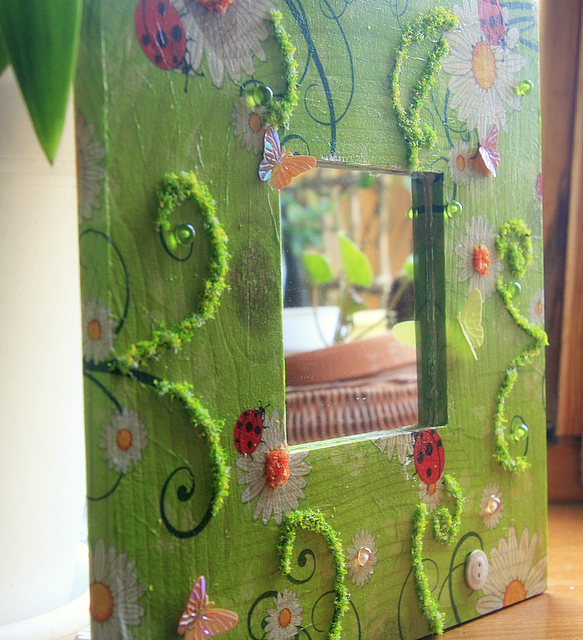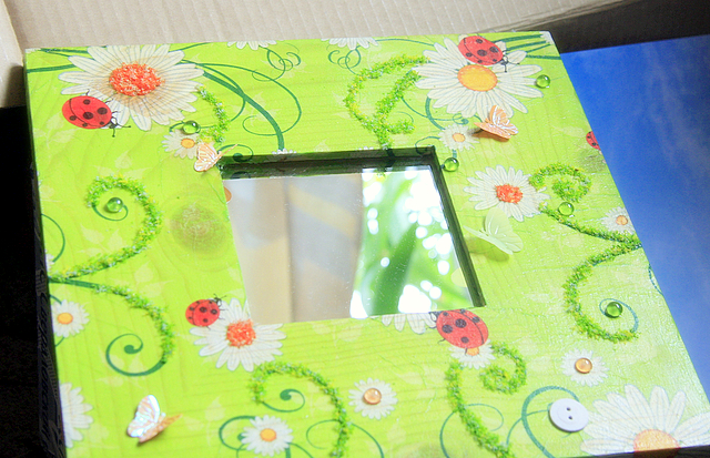 для одного весеннего обмена сделала вот такое зеркальце... декупаж + декор
