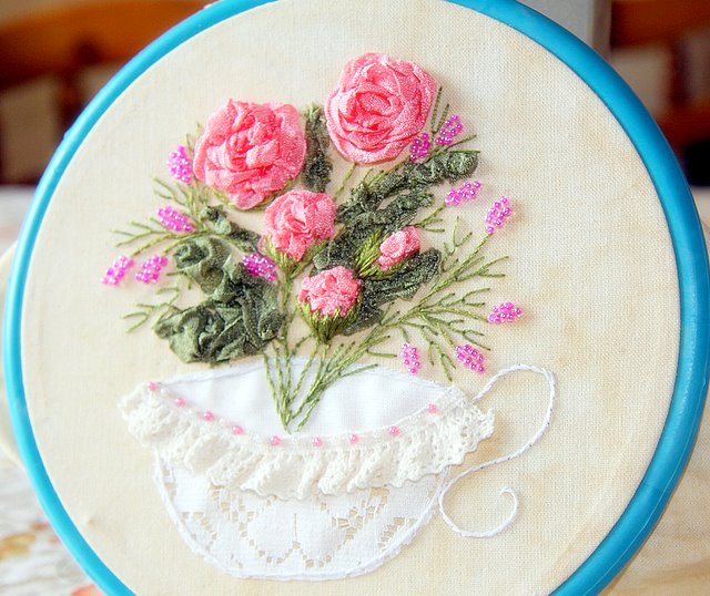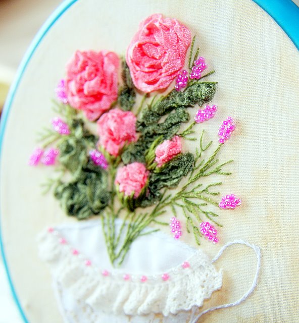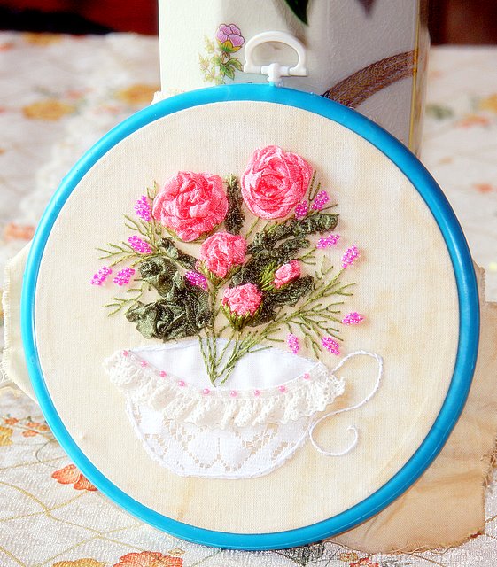 недавно решила поучаствовать в двух проектах по обучению объемной вышивкой. Сделала первые этапы работ, а вдохновение осталось - решила сесть за ленты, в итоге получилась вот такая картиночка, можно сказать авторская, всё придумала сама, даже эскиз чертила :))))
