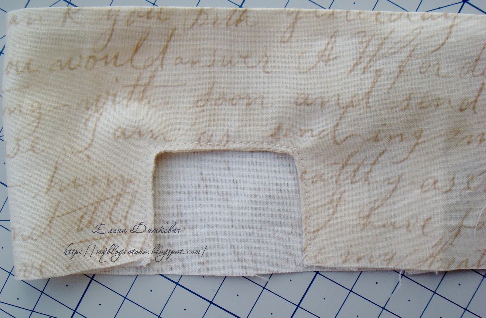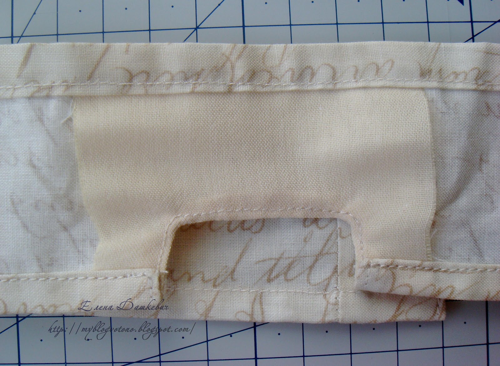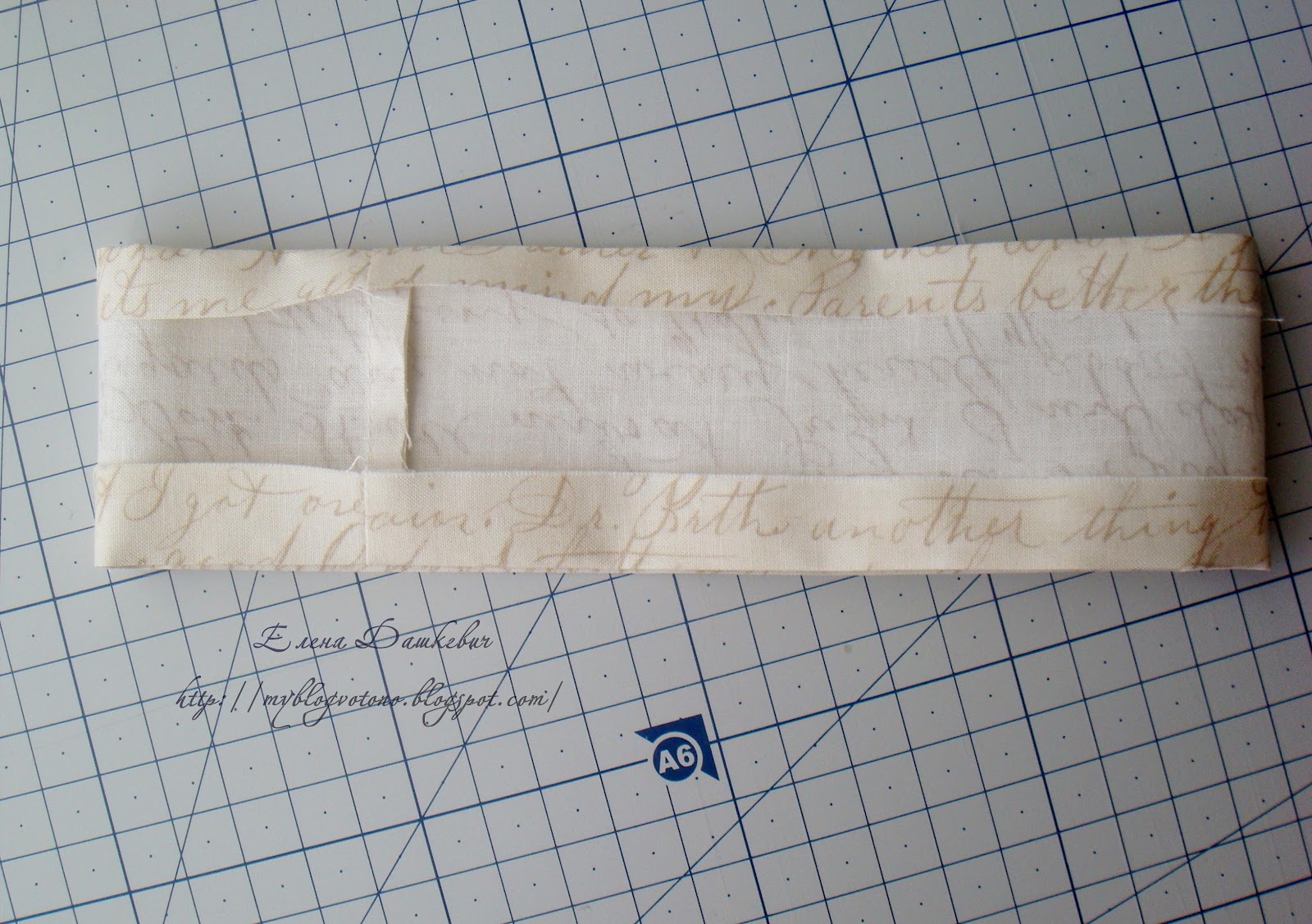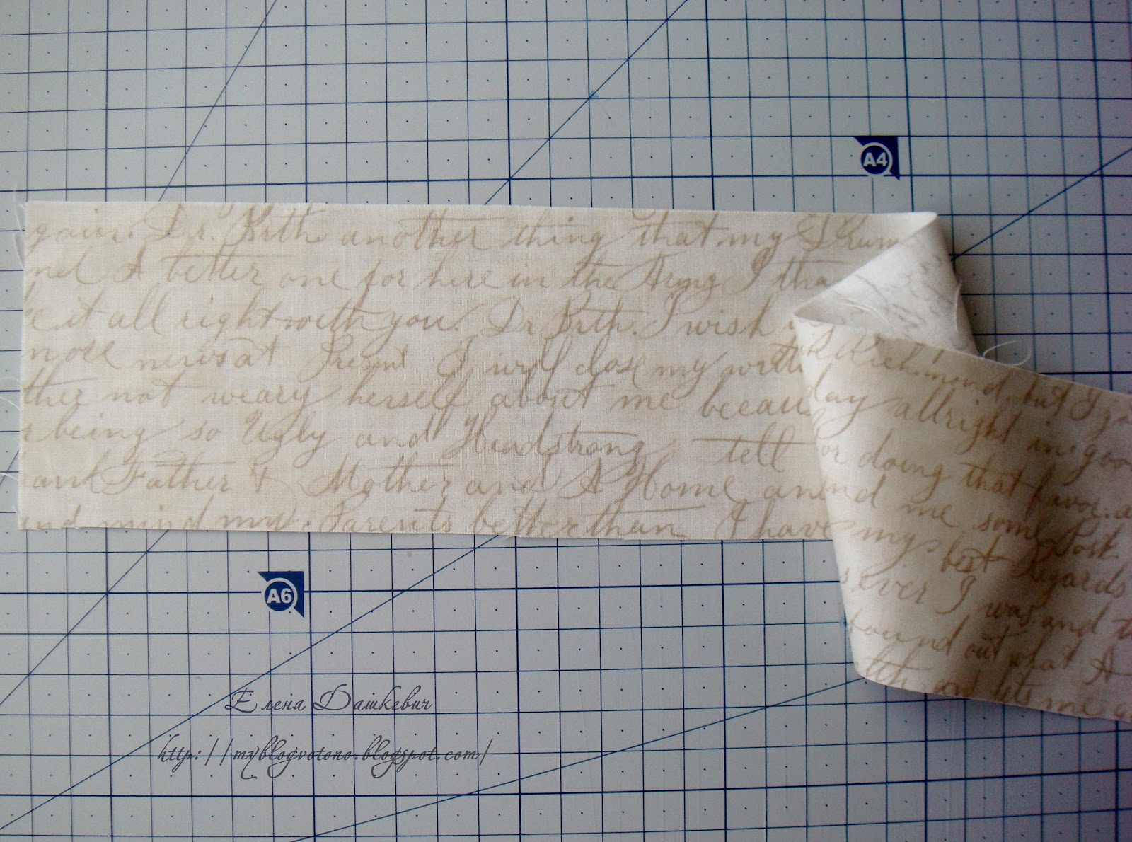 После того, как корзиночка готова, можно сшить для нее чехольчик или получехольчик, как у меня. Я использовала очень красивую винтажную ткань с текстом. Отмерила длину по периметру корзинки + 1см припуски на швы. Ширина у меня совсем небольшая - 8см.