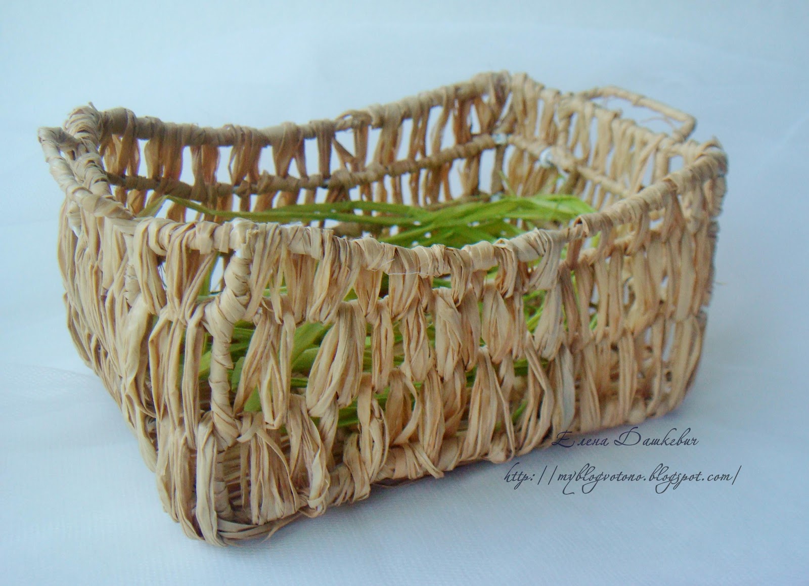 На дно корзиночки я положила немного зеленой рафии,