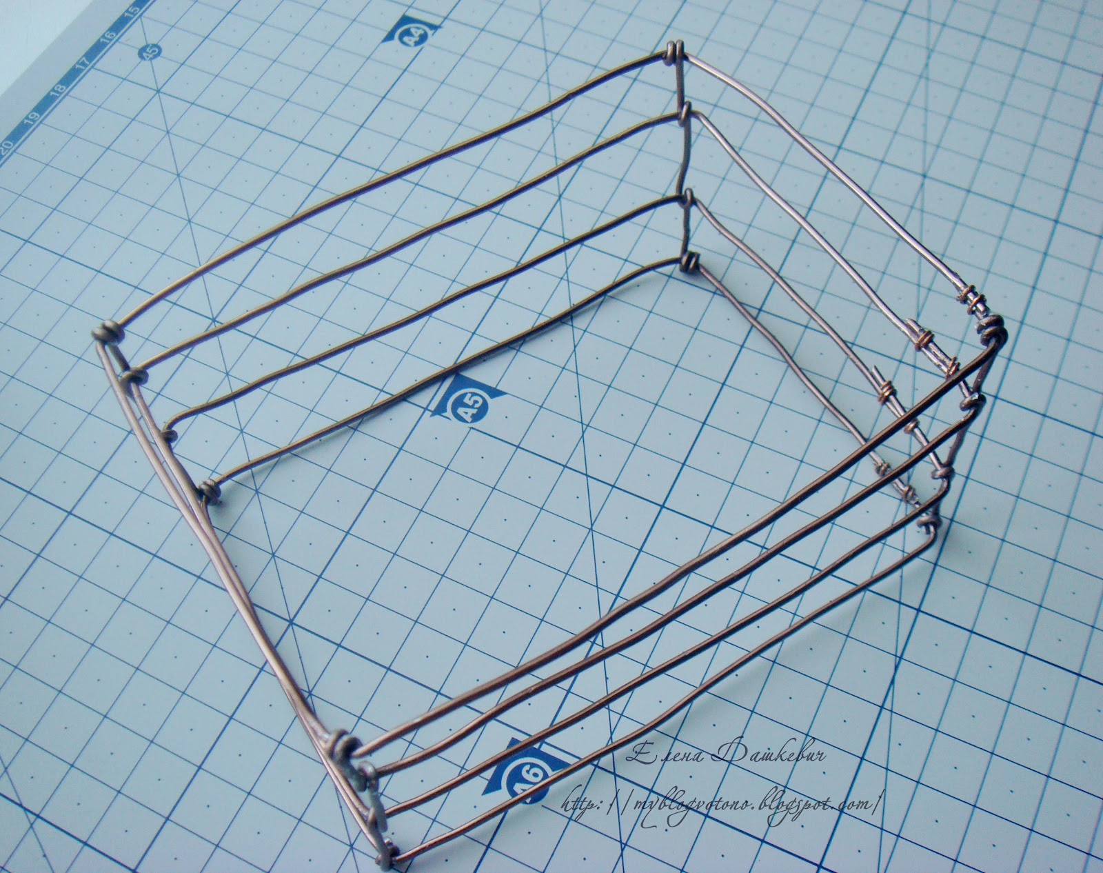 Сначала создаем каркас нашей корзиночки - формируем из проволоки несколько одинаковых прямоугольников. У меня они небольшого размера 11 на 8 см.