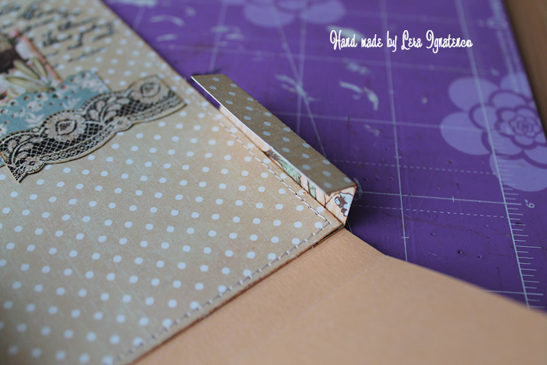 Затем приклеиваем уже задекорированную заготовку из скрапбумаги поверх приклееных полосочек. Таким образом мы и укрепляем будущую конструкцию, и придаем более эстетичный вид (поскольку, если заглянуть внутрь уже готовой подставки, нам, в первую очередь, будет видна именно задняя поверхность, поэтому "шовчики" будут спрятаны)))