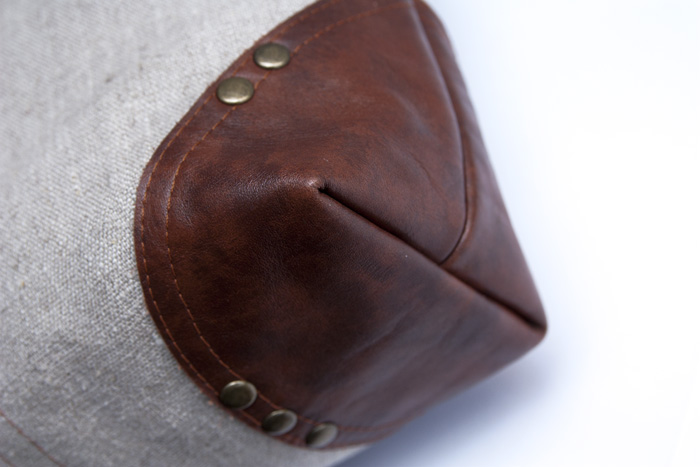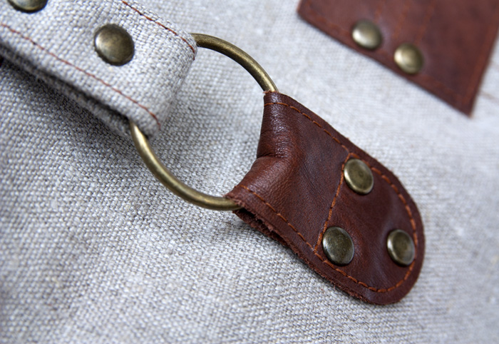Ручки льняные, но в области "держания" я их укрепила с ДВУХ сторон кожей. Все это прошито нитками для кожи и закреплено двусторонними хотильонами (то есть ручки одинаково красиво выглядят со всех сторон)