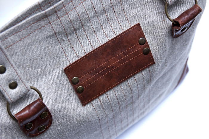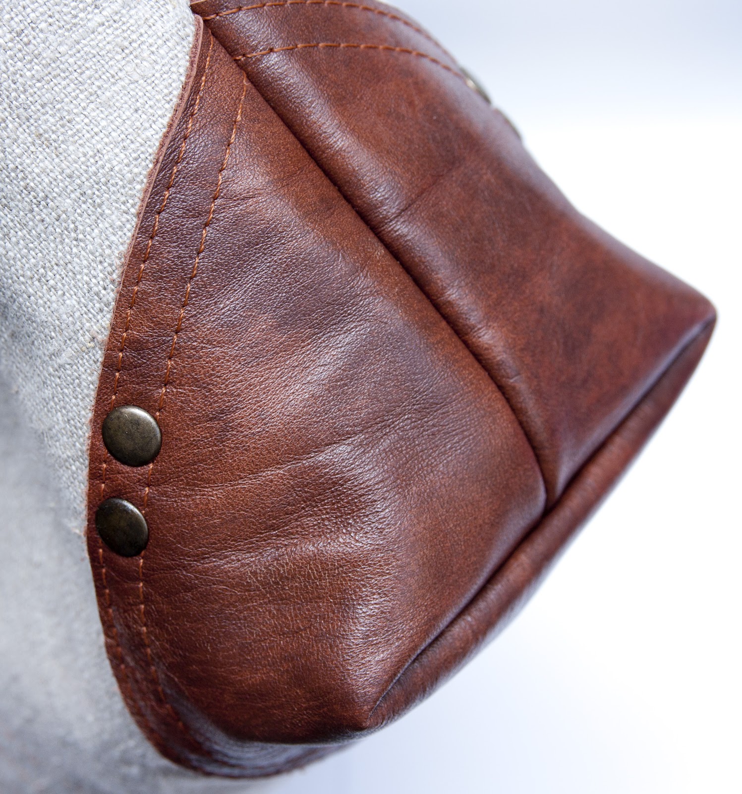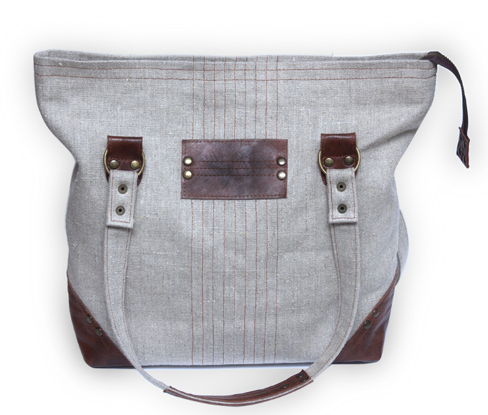 Очень натуральная. Сшита из льна грубой обработки и состаренной натуральной кожи (кожа с небольшими разводами и легкими потертостями).