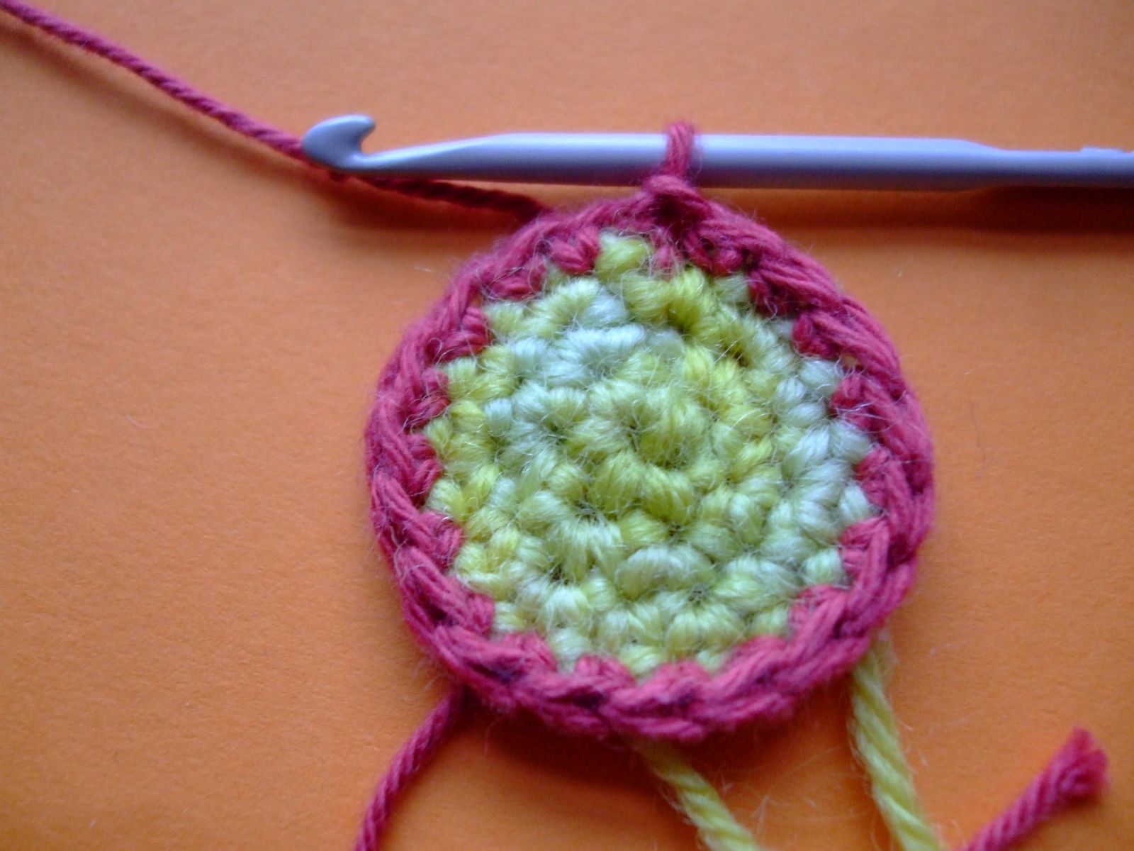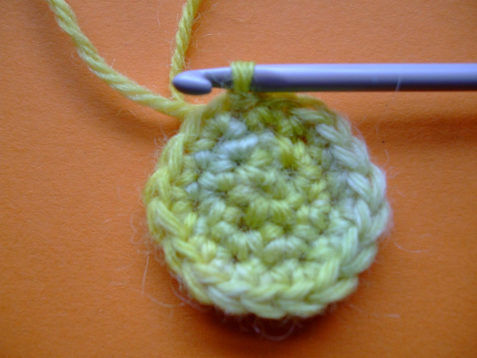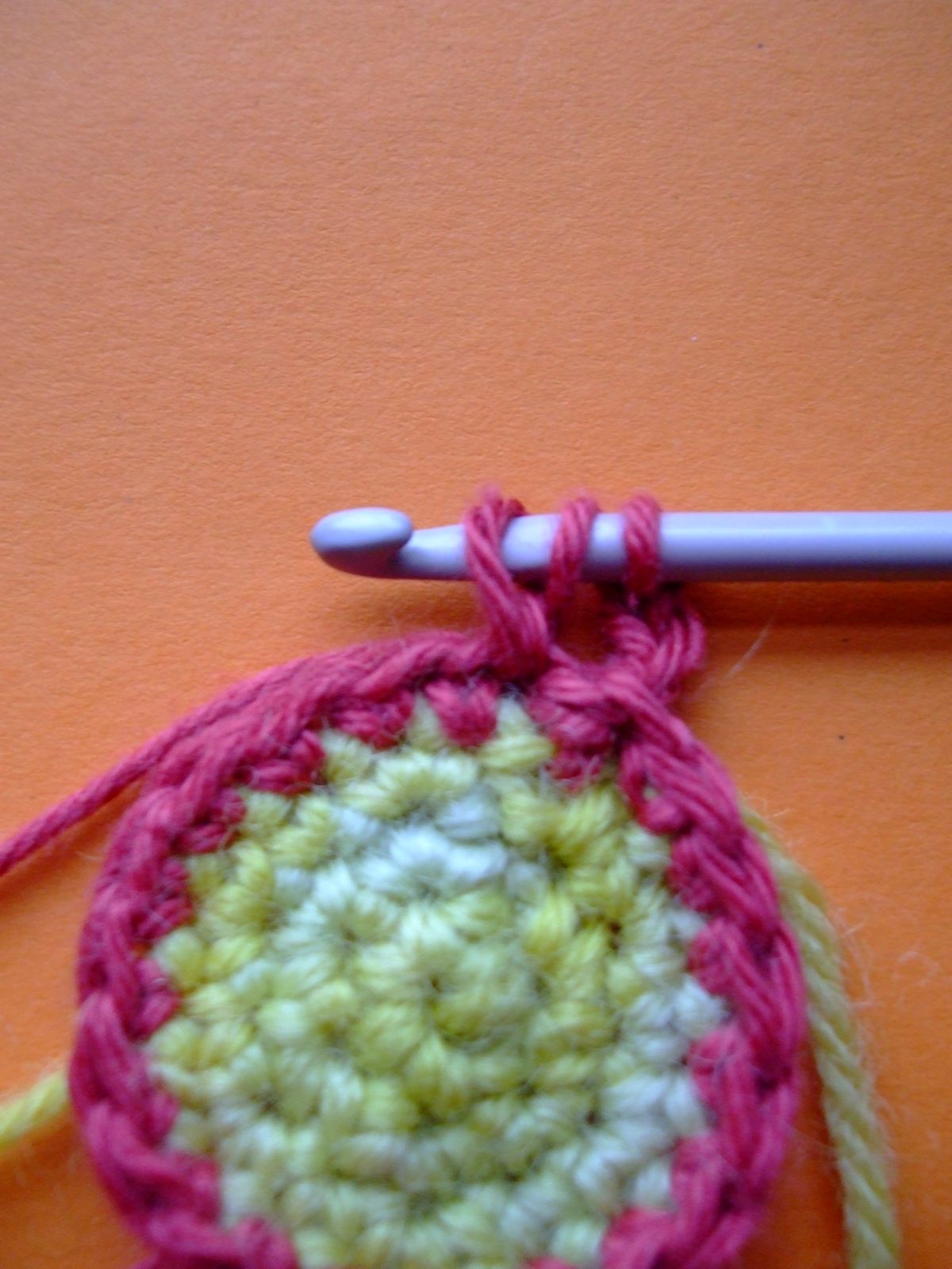 Round 3: Change colour.  In new colour ch1, 1sc in each sp around [18 sts total]