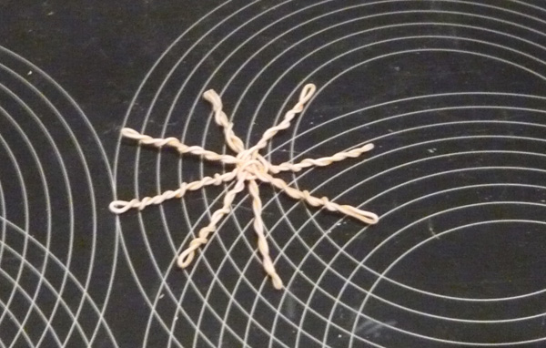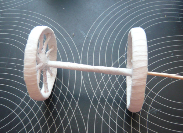 Начинаем обматывать нарезанной на полоски 7-9 см гофрированной бумагой наши колёса и спицы.