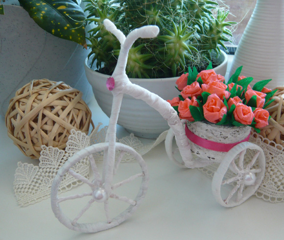 Делала две корзины цветов ,потому что задумывала ещё одну корзинку на переднее колесо..но потом поняла что это слишком) Осталось прикрепить корзинку с цветами и наш велосипед готов))