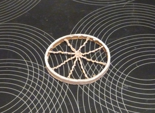 Теперь из проволоки будем крутить спицы,периодически примеряя их на кольцо(чтобы они свободно поместились в колесе и уверенно там держались),если всё подогнать точно,то их даже клеить не надо,будут держаться).И к слову скажу что это самая трудоёмкая часть работы.
