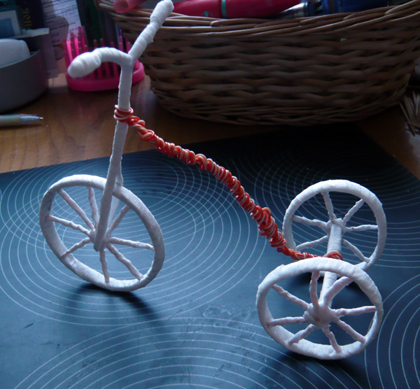 Приступим к изготовлению руля.Поскольку у меня проволока двойная я придумала сделать так как на картинке,если у вас одиночная,то просто две проволоки с каждой стороны и смотаете их над колесом вместе.Размер проволоки для руля 14 см..потом 4 см с каждой стороны отогните на руль).Примерив это дело несколько раз тоже оборачиваем руль бумагой.