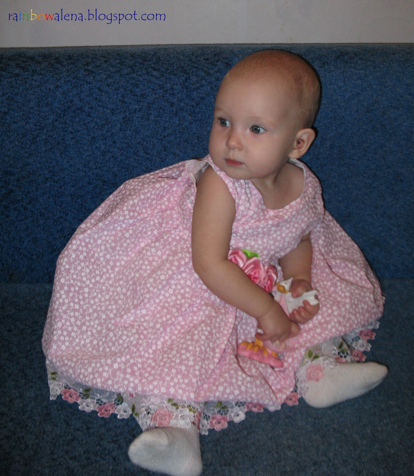 Платье для нашей принцессы. Ткань - бязь. Выкройка на глаз, проще некуда, юбка - прямоугольник присборенный на талии. Сзади замочек и поясок завязан. Подьюбник отдельно - слой из х/б с кружевом по низу (к ножкам) и слой из сетки тоже с кружевом. Розочки из атласных ленточек - 2 оттенка розового и салатовый (какой нашелся в хомячьих запасах).