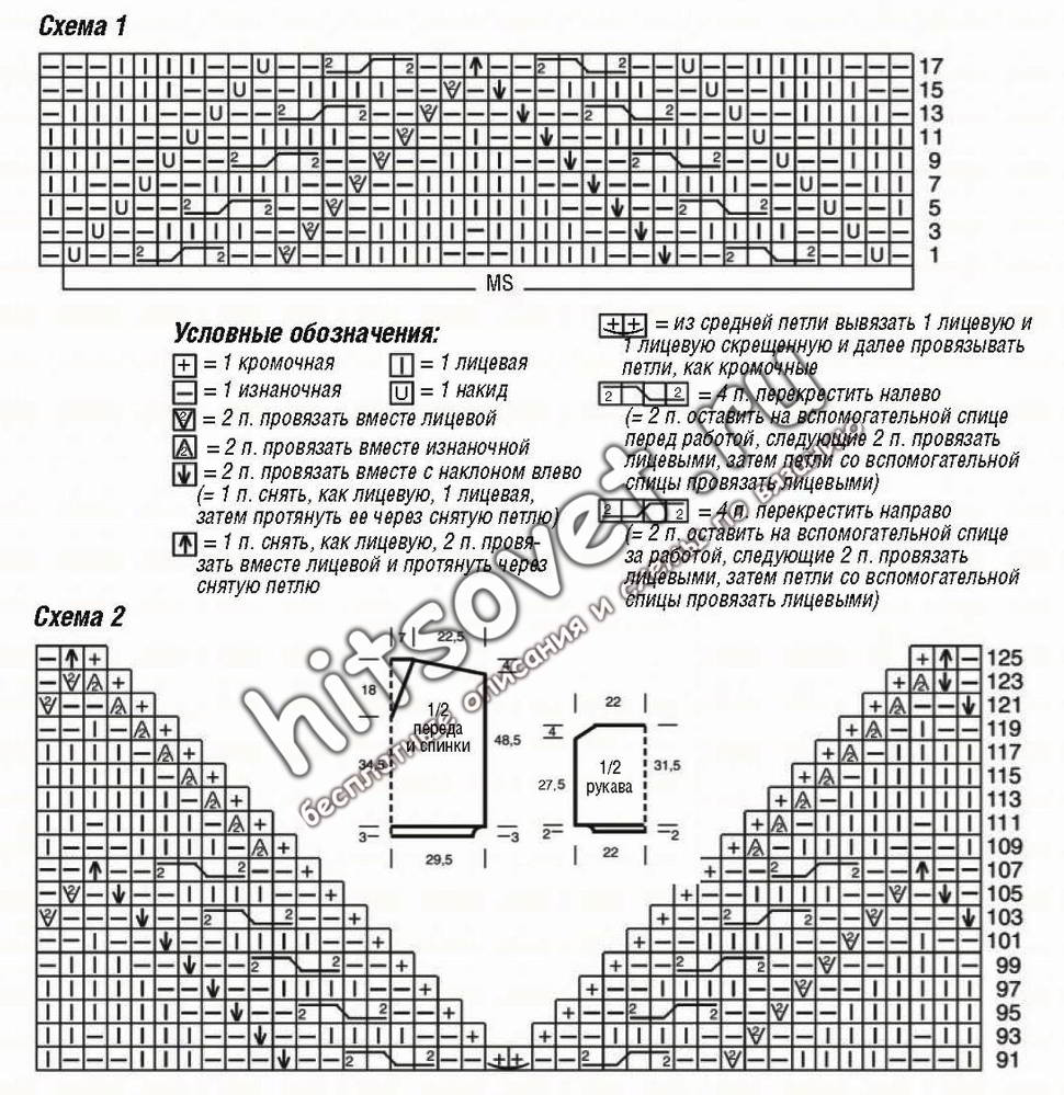 Для придания формы в каждом круговом ряду узора 1 среднюю петлю передней части провязать с предыдущей и последующей петлями вместе следующим образом: 2 петли снять вместе, как лицевые, 1 лицевая, затем протянуть ее через снятые петли. Затем связать еще 1 круговой ряд лицевыми и закрыть петли, как лицевые. Вшить рукава, выполнить боковые швы и швы рукавов.