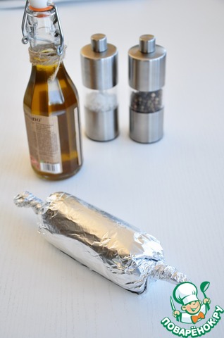 С помощью фольги скрутить рулет так, чтобы каннелони была внутри посередине. Плотно свернуть фольгу с фаршем в виде конфеты. Запекать при 180* 25-35 минут в зависимости от размера.