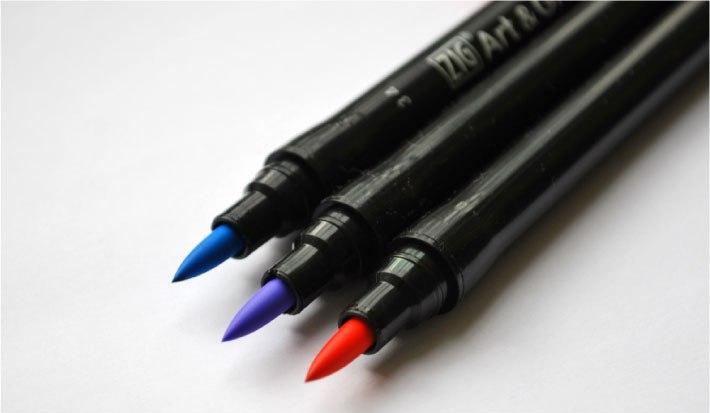 С одной стороны у маркера находится тонкий фломастер, (идеально подходит для проработки деталей, набросков и штрихов), а с другой - высококачественная резиновая кисть. При помощи гибкого наконечника с резиновой кистью можно создавать линии различной длинны и толщины. При этом чернила отлично ложатся на бумагу, резину или силикон, кисть не слоится, не изнашивается и сохраняет свою первоначальную форму, что делает ее идеальным инструментом для раскрашивания или работы с резиновыми или силиконывыми штампами. В палитре маркеров насчитывается 80 цветов, производство Япония.