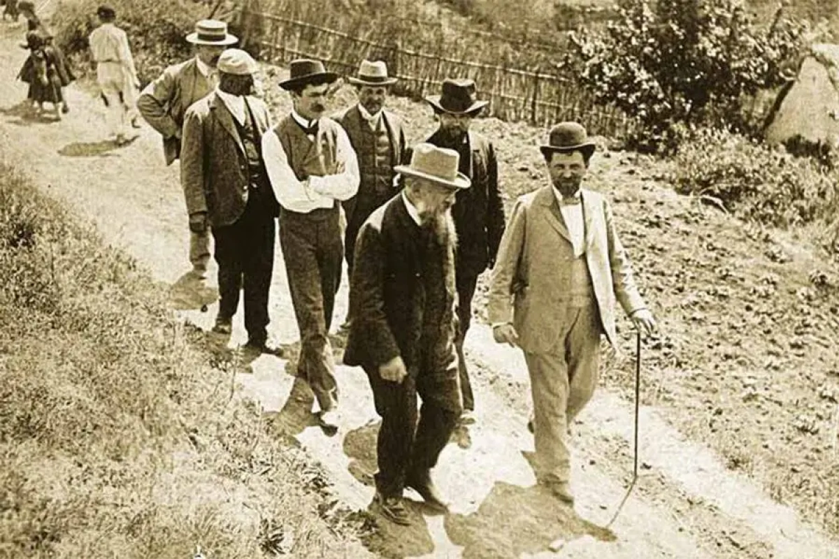 Огюст Роден во время посещения Словакии. 1902. Впереди идут Огюст Роден и Альфонс Муха, за ними — художники Милош Йиранек, Йозеф Маржатка и Йожа Упрка. Музей чешской литературы, Прага.