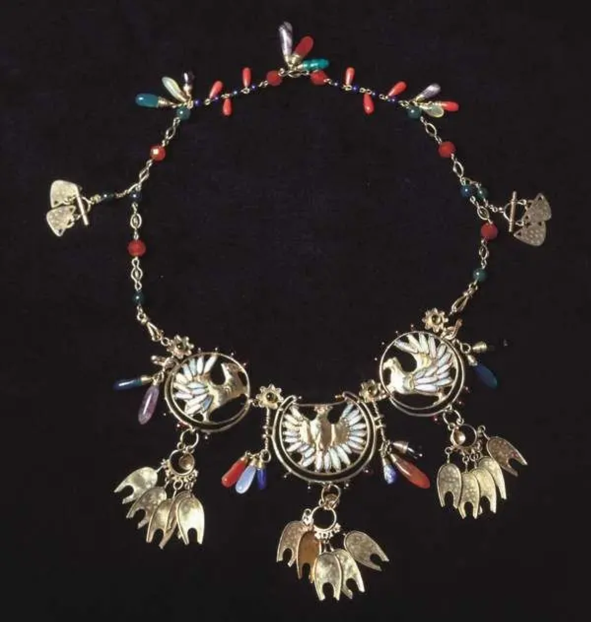 Свадебным подарком для Марушки было изысканное ожерелье. Художник, конечно же, создал эскиз и для этого украшения, а выполнил его пражский ювелир Ян Рехнер в 1906 году. Золотое ожерелье украшено амулетами-подвесками из полудрагоценных камней, гроздьями подков и тремя голубками — знаками любви и символами супружества.