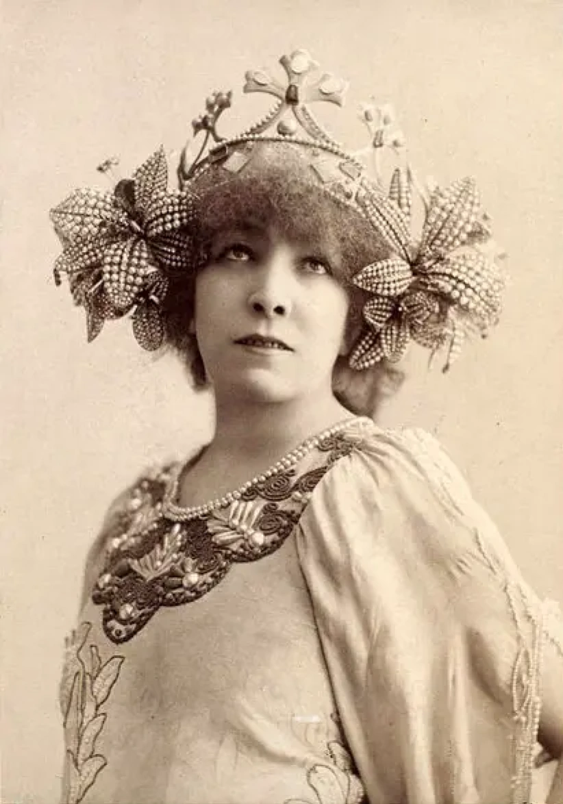 Знаменитая актриса Сара Бернар в головном уборе из лилий, созданном по эскизу Альфонс Мухи