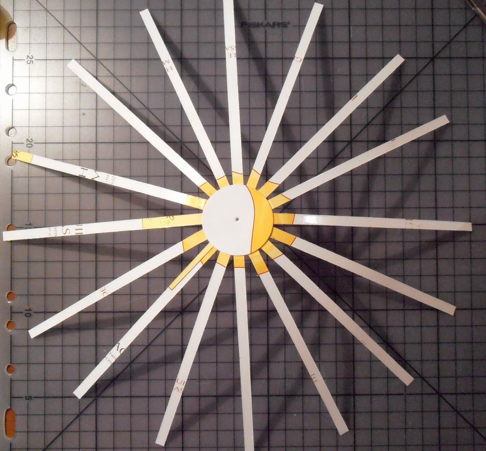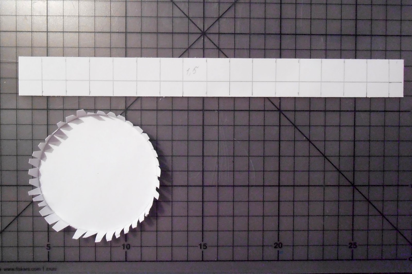 13. С помощью циркуля намечаем круг меньшего диаметра, помня о том, что припуск на приклеивание верха составляет 5 мм. Следовательно, радиус внутренней окружности должен быть меньше на 5 мм ! После этого делаем метки строго по середине между линиями, получая 16 сегментов по 22 градуса (можно заранее сделать их с помощью транспортира на листе бумаги, а затем вырезать круг - это индивидуально).