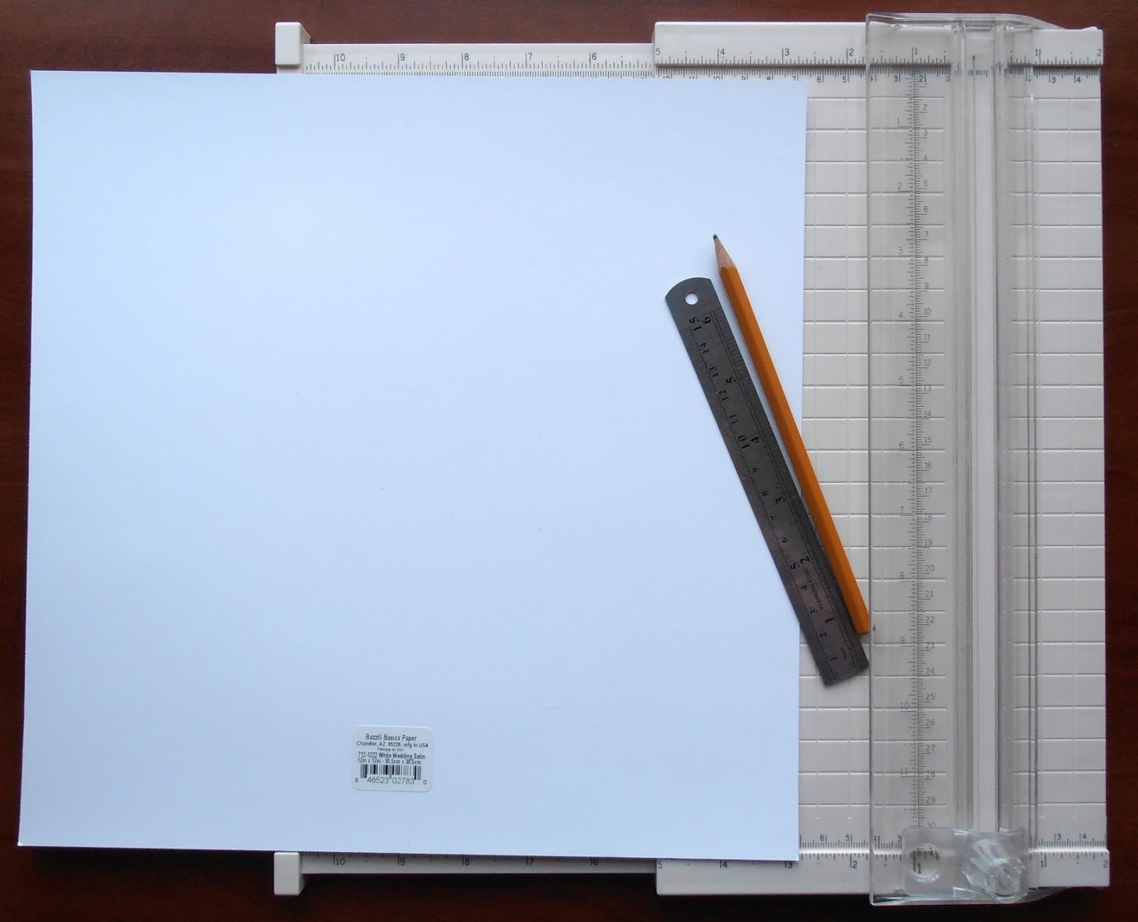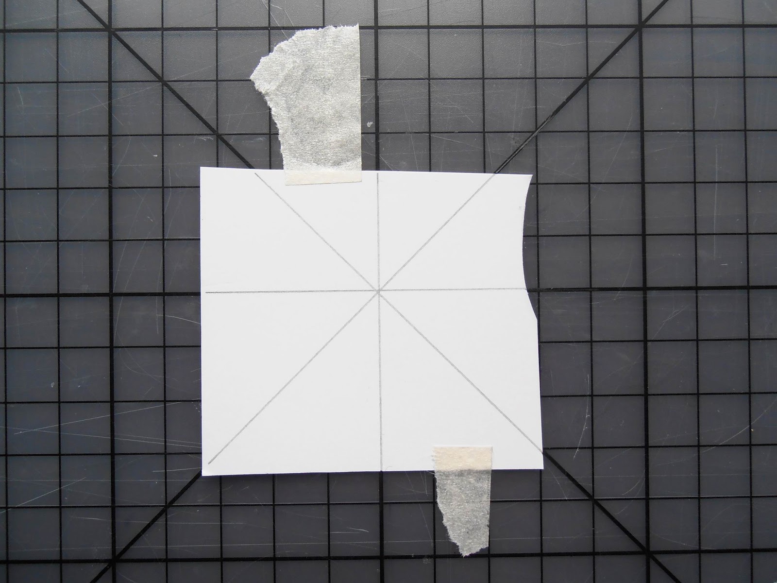 11. Теперь приготовим основу для склеивания верха. В нашем случае - это круг, который я сделаю с помощью компостера 2,5 дюйма (3,7 см). Возьмём небольшой лист картона и закрепим его на макетном коврике или листе в клеточку. Наметим четыре основные пересекающиеся линии.