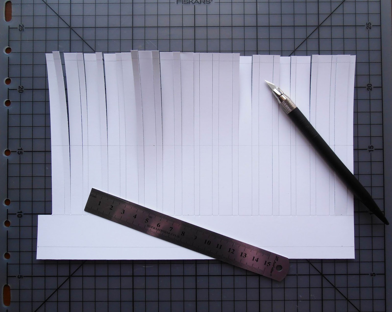 3. С помощью резака или макетного ножа делаем вертикальные разрезы до уровня высоты основания с интервалом в 5 мм и 10 мм длиной 125 мм.