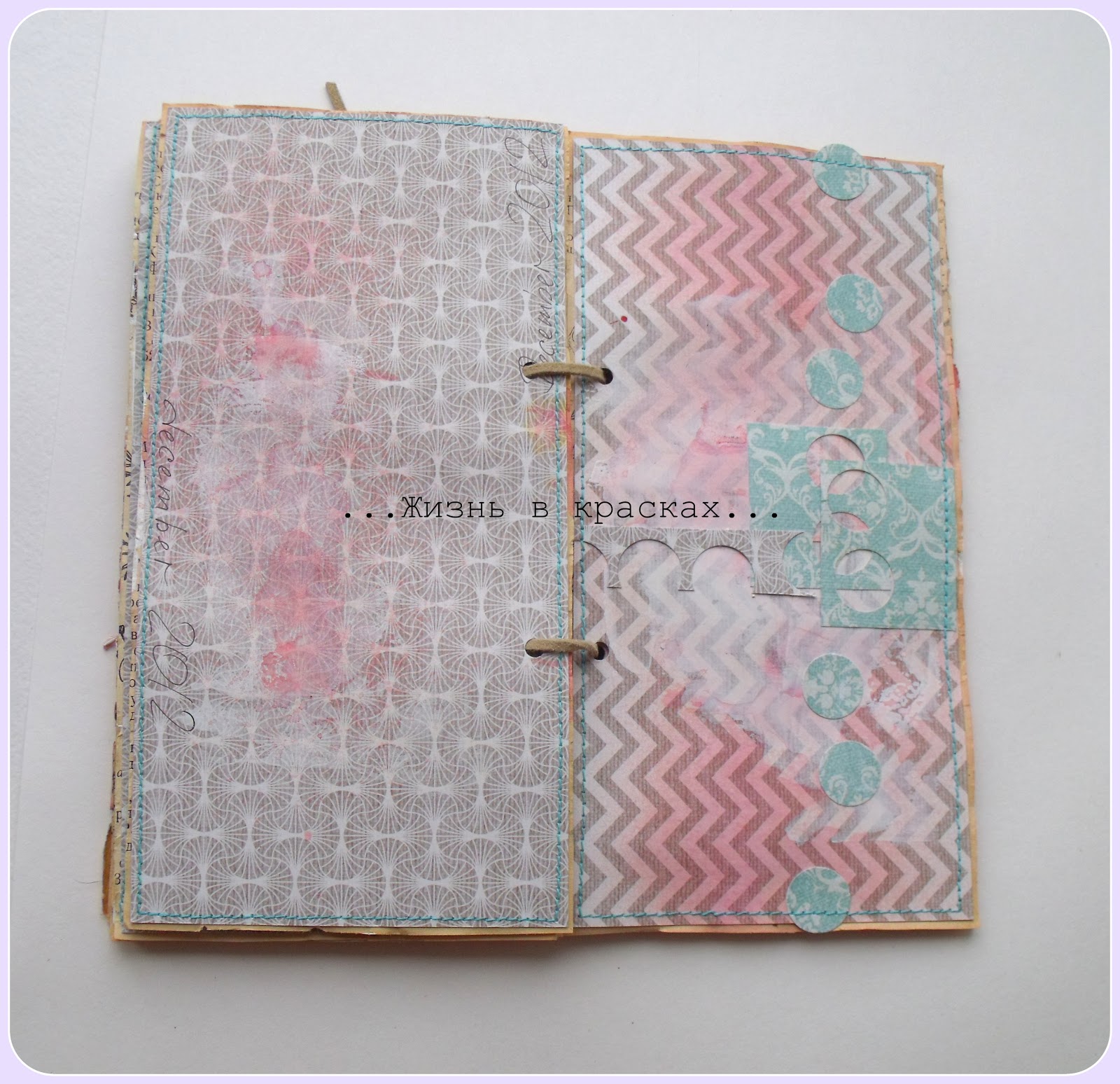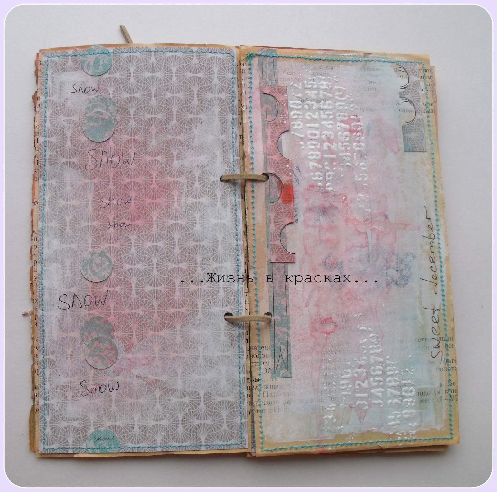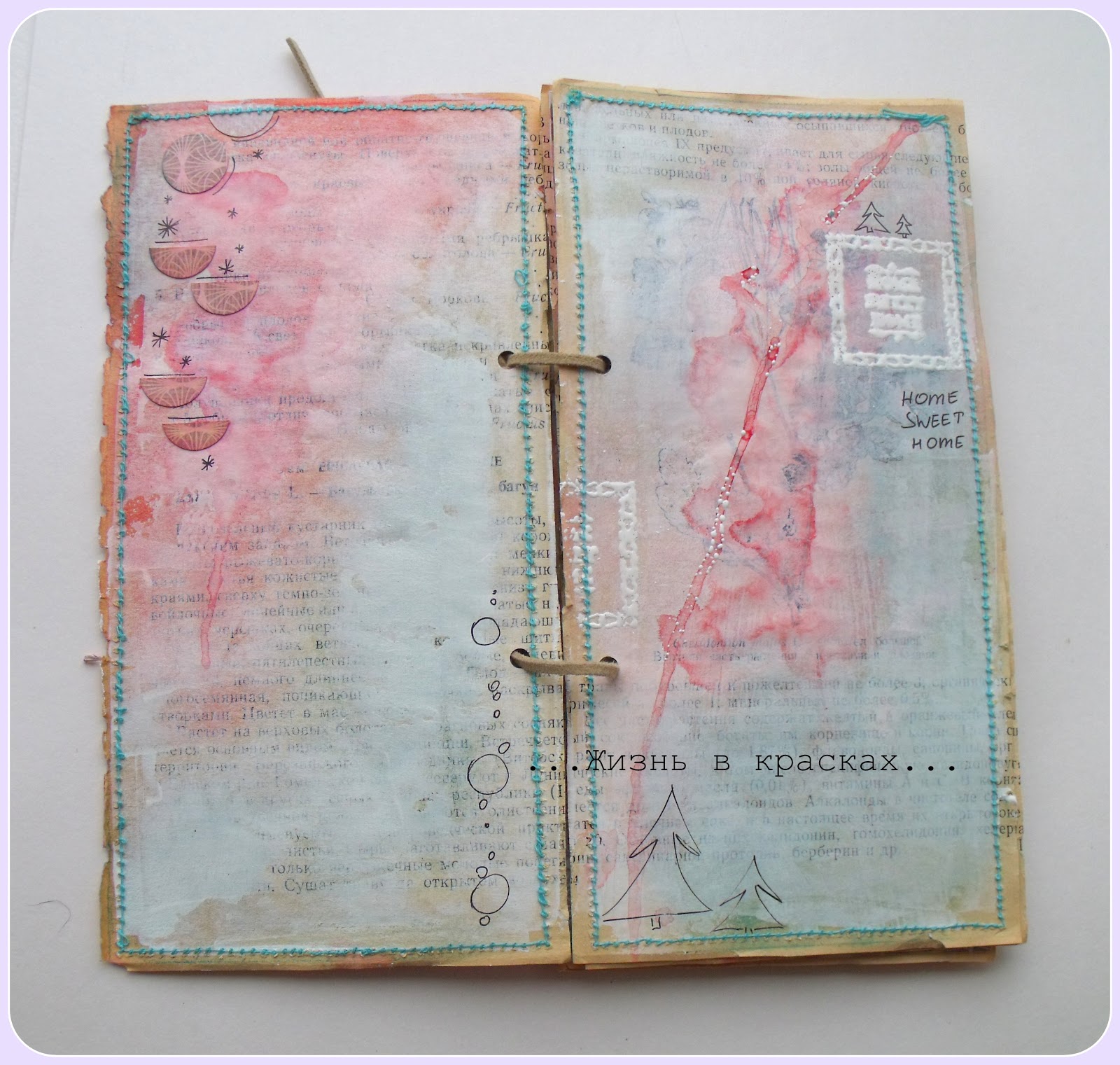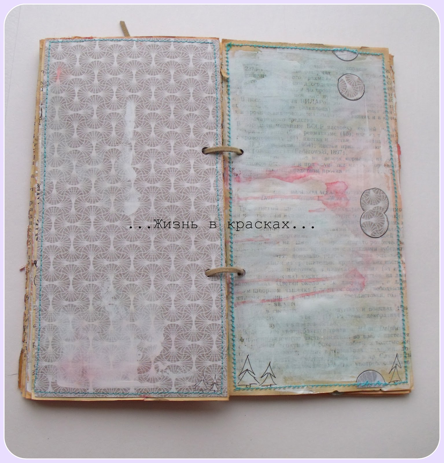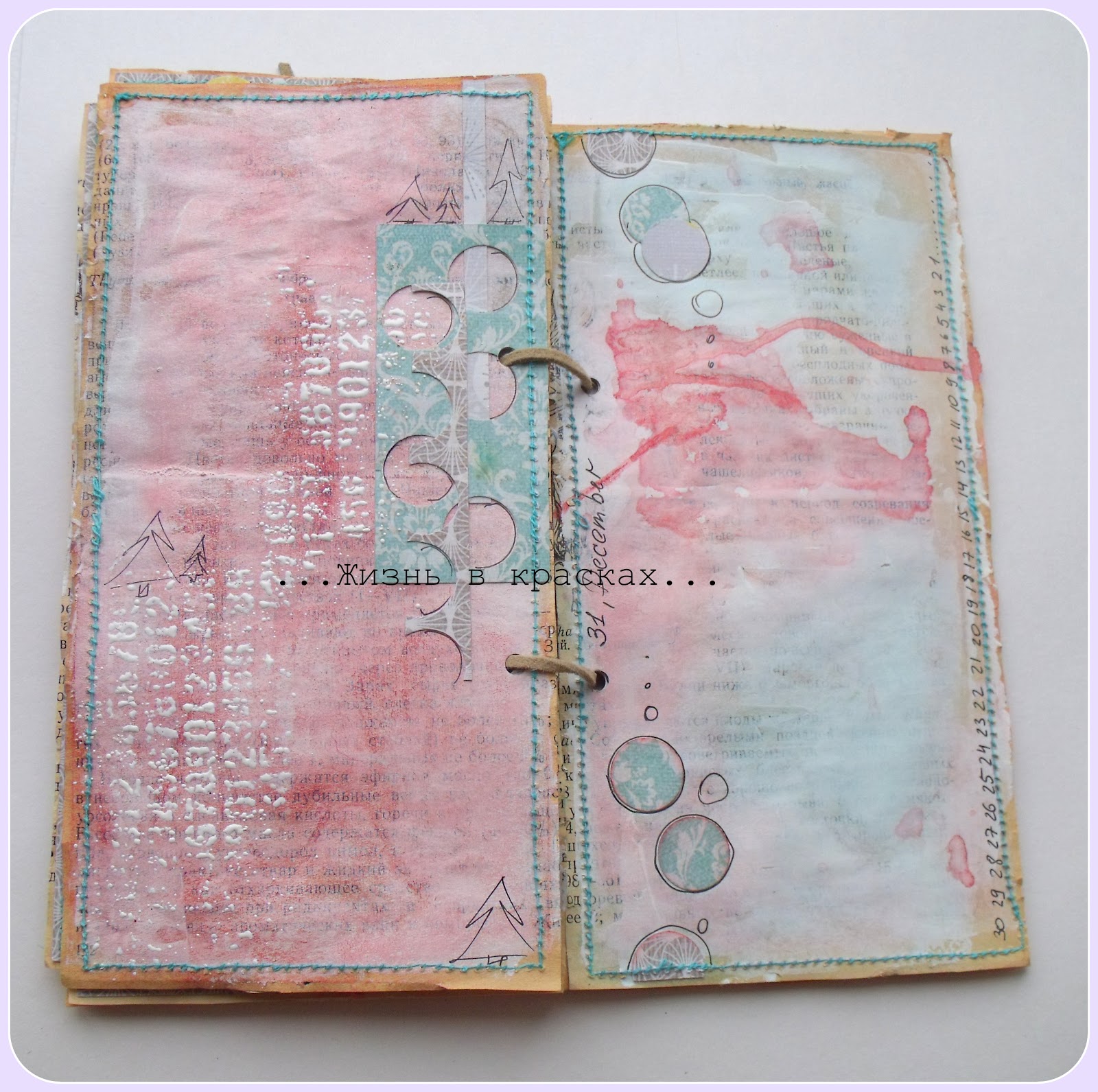 Ждем пока грунт высохнет или подсушиваем феном. Затем начинаем декорировать страницы. Я использовала спрей, краску и скрап-бумагу в тонах палитры, добавила эмбоссинг белой пудрой и немного дудлинга. Для того, чтобы странички приобрели законченный вид, прострочил их на машинке. Осталось сделать дырочки для колец или шнурочков и ежеденевник готов!