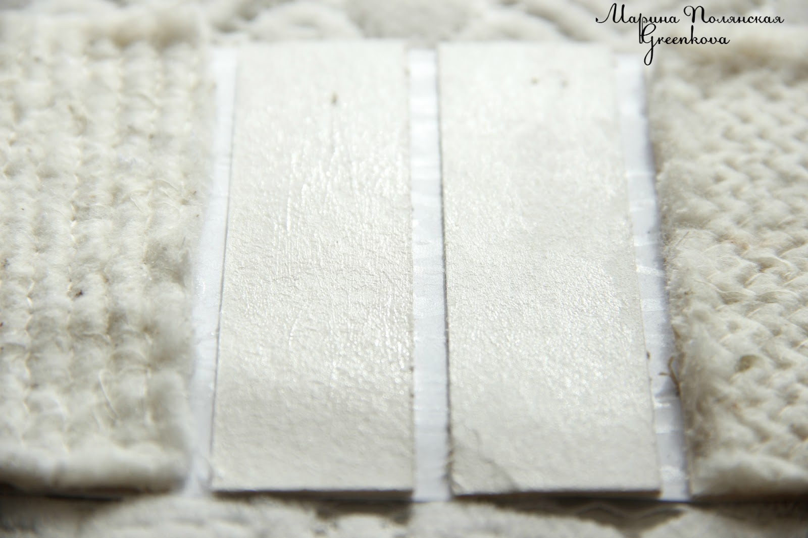 Затем на наши 2 картонки по бокам, которые 10х15 приклеиваем синтепон или ветошь как у меня, а средние полоски смазываем клеем-карандашом.
