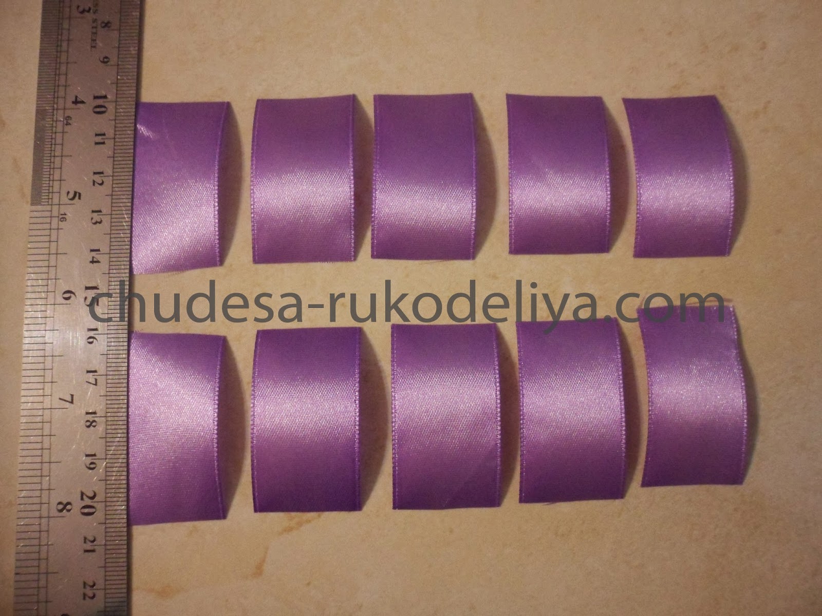 Для среднего слоя нашей дюшески я выбрала ленту светло-фиолетового цвета длиной 4,5 см-10 шт.