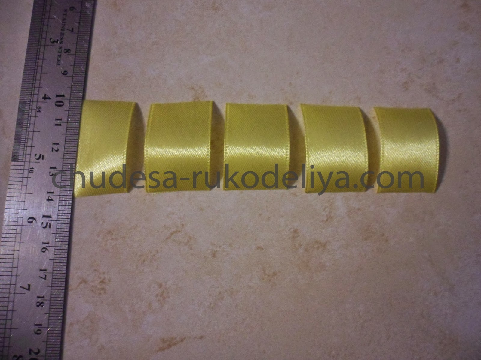 Нарезаем ленту. Для серединки я выбрала ленту желтого цвета, ее нужно 5 отрезков длиной 4 см.