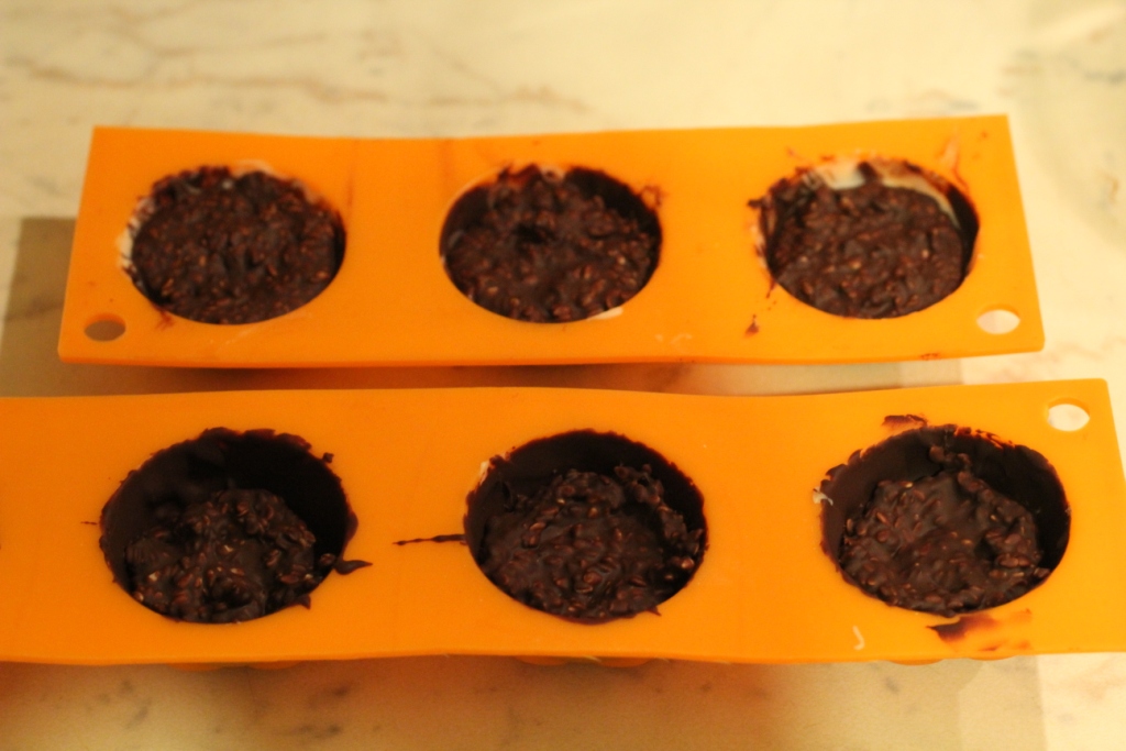 Теперь делаем мраморные конфеты. Белый и темный шоколад по очереди наносим на стенки формы. Теперь формы нужно слегка наклонять и крутить, чтобы шоколад немного перемешался и равномерно распределился по стенкам. Можно перемешать при помощи деревянной шпажки. Охладить 10 минут в морозильной камере.