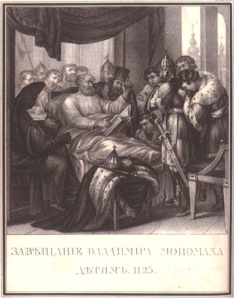 Завещание Владимира Мономаха детям, 1125. Литография по рисунку художника Бориса Чорикова для издания «Живописный Карамзин» (Санкт-Петербург, 1836)