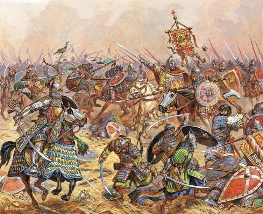 Постепенно возникли династические браки между половецкой знатью и княжескими домами, однако это не мешало половцам ходить на Русь, а Руси ходить в ответ на половцев. Так вот, в 1222 году передовые отряды монгольской орды разбили объединенное войско половцев на Кавказе и те обратились за помощью к князьям Руси. Князья решили прислушаться к ним и присоединились к походу на монголов. Объединенное войско Руси возглавили три Мстислава – киевский, черниговский и галицкий. Монголы прислали к ним послов, говоря, что не делали им зла, что зря они послушали половцев и лучше вместе напасть на последних. Но князья к их словам не прислушались, а самих послов убили. Происходит битва на реке Калке, где объединенное войско терпит поражение в основном оттого, что каждый из Мстиславов и половцы воюют по своему разумению. Монголы казнят пленных, пируя на них, а уцелевшие князья возвращаются на Русь и снова погружаются в свою извечную борьбу.