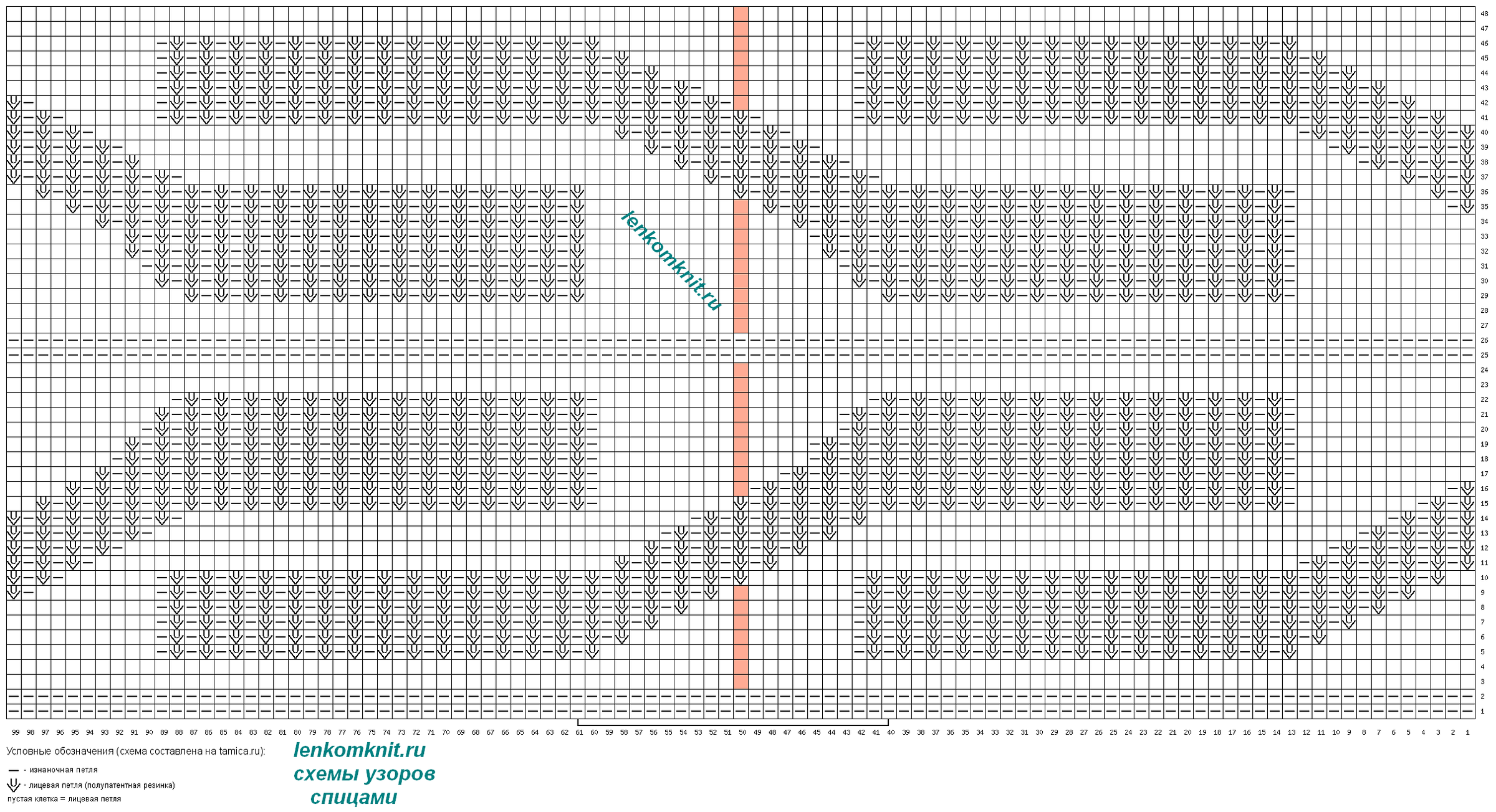 В ширину нарисовано 99 петель (сколько убралось в программу). Оранжевым цветом выделен центр схемы (переда и спинки). Раппорт по ширине выделен в нижней част и схемы маркером.