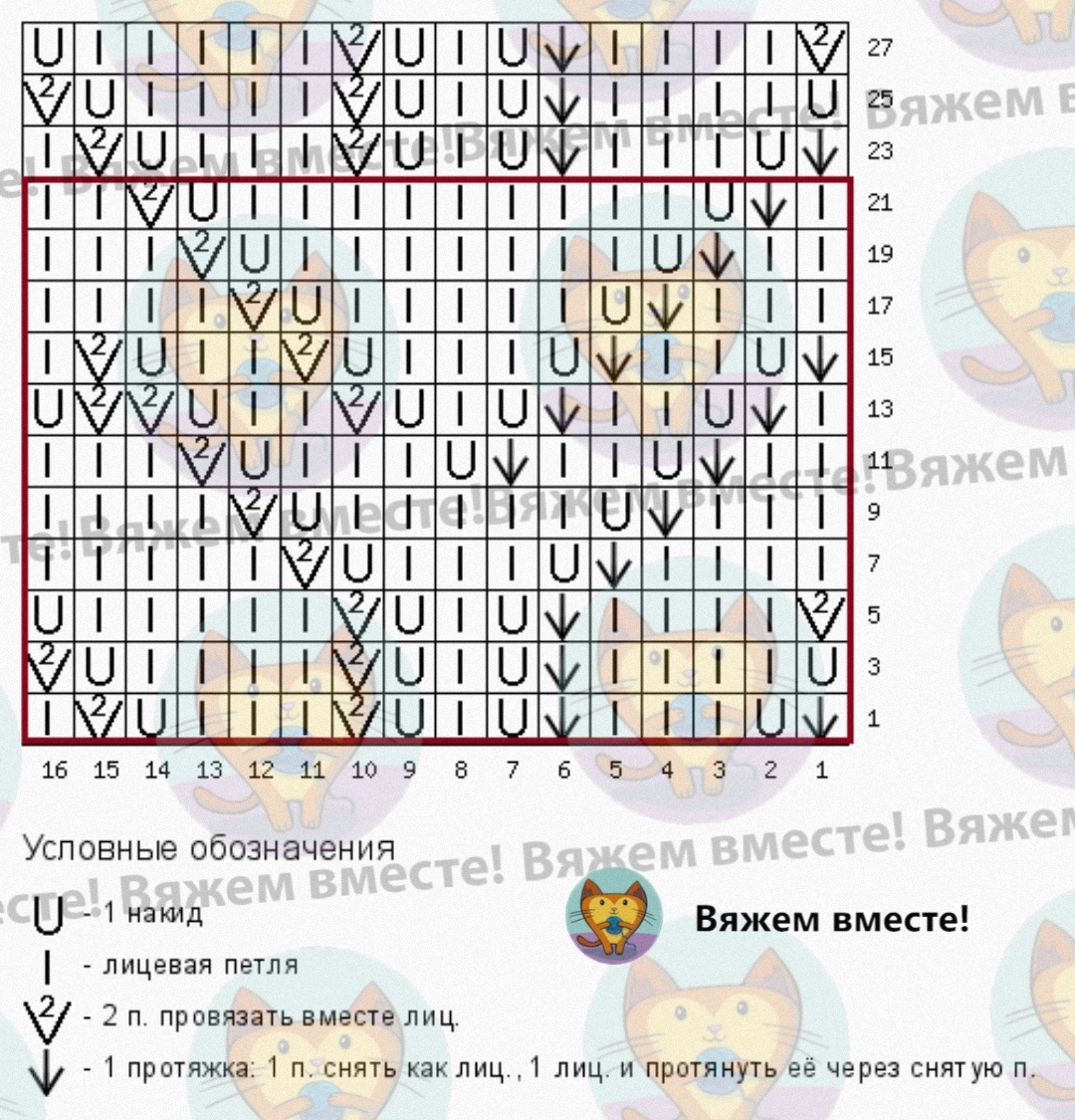 Раппорт ажурного узора выделен красной рамкой на схеме и равен 16 петлям по ширине и 22 рядам по высоте.