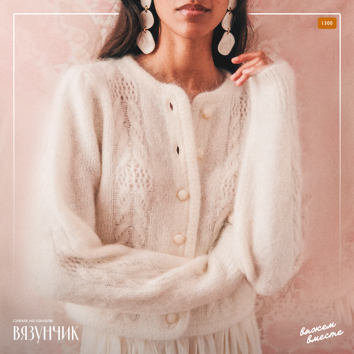 Сам жакет связан лицевой гладью, а рукава и полочки украшены вертикальными вставками из ажурных жгутов. Очень красиво и нежно!