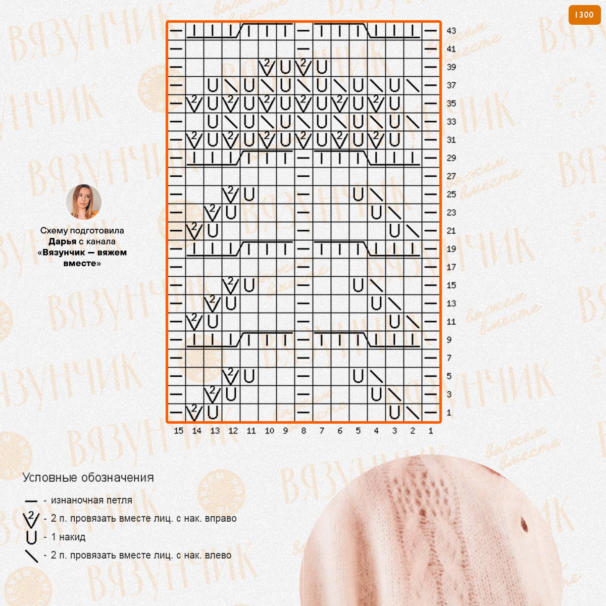 На схеме только лицевые ряды. Изнаночные надо вязать по рисунку.