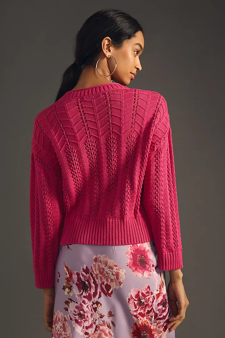 Кардиган сделан немного укороченным, длиной чуть ниже талии. Внизу – широкая резинка. Плечо спущенное.