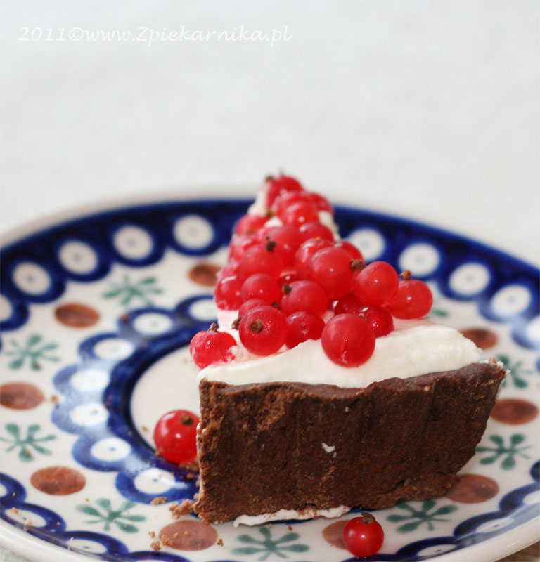 Разогреть духовку до 180 ° С и выпекать около 20 minut.После охлаждения выпечки, мы делаем начинкуСметану сбить , добавить расплавленный, слегка охлажденный белый шоколад, размешать осторожно и залить всю основу холодным . В версии, которую мы делаем с маскарпоне аналогично, только сбиваем крем с маскарпоне. На верх выкладываем смородину .Охлаждаем в течение приблизительно 30 минут и подаем.