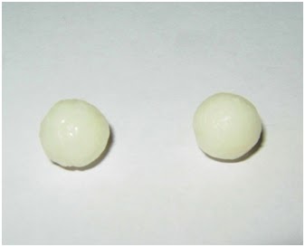 Сделав две заготовки бусин диаметром 1,5см (имейте в виду, что заготовка по размерам должна быть меньше предполагаемого готового изделия на 1,5-2 мм), отправила их в духовку подсушиться. Именно подсушиться, а не запечь, т.к. клей все-таки не предназначен для запекания, и не известно, как эта химия поведет себя, после того, как ее изжарить, а нам необходимо, чтобы после всех мытарств, ей уготованых, она без проблем растворялась.