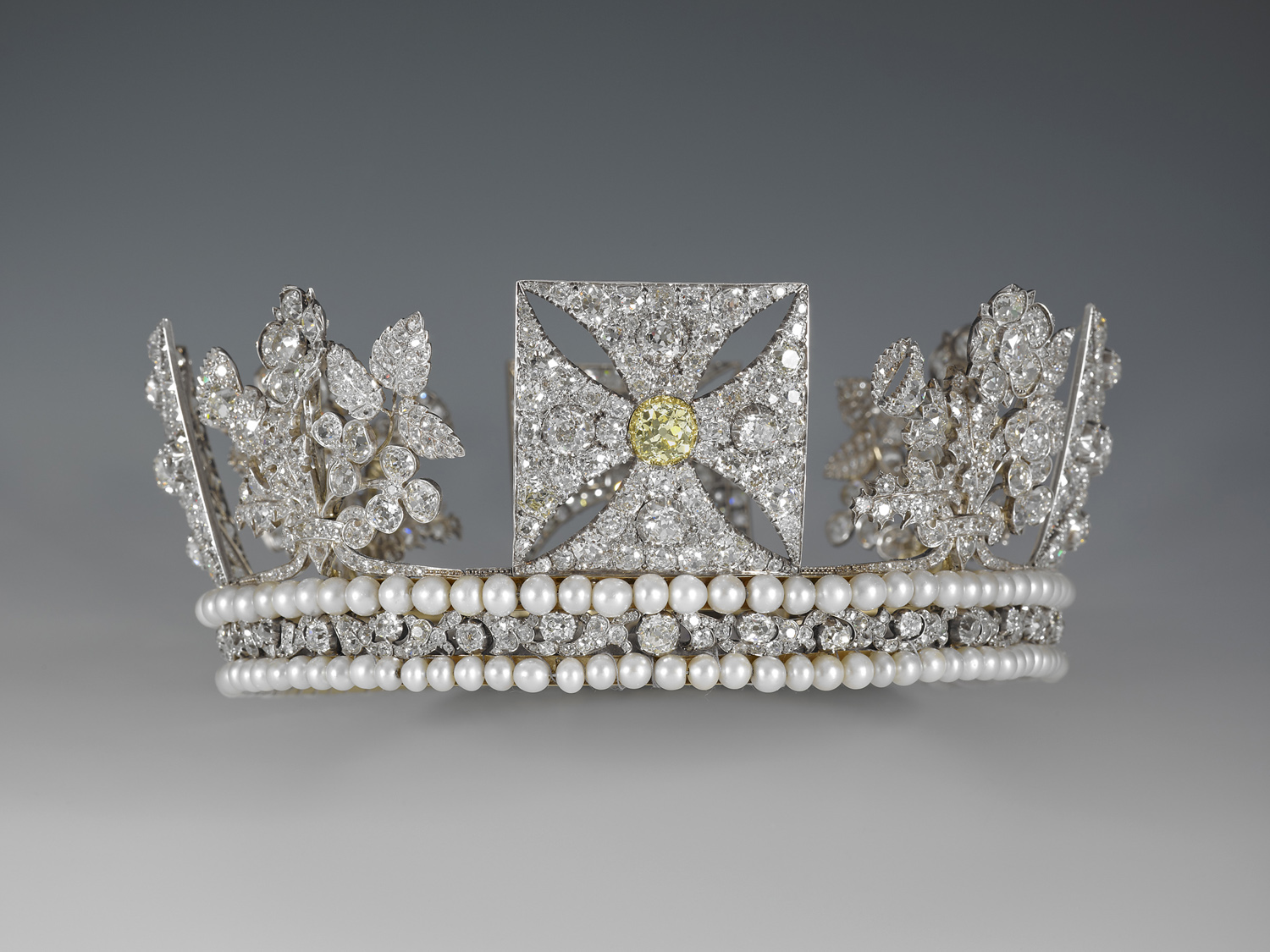 Бриллиантовая диадема Диадема с 1333 бриллиантами была изготовлена в 1821 году, специально к пышной коронации Георга IV. Центральное место занимает огромный (4 карата), очень редкий бриллиант золотистого оттенка. Диадема украшена орнаментом из цветов-символов Англии, Шотландии и Ирландии: розы, чертополоха и трилистника. Елизавета II надевает ее по особым случаям: например, на ежегодную церемонию открытия Парламента, а также позирует в ней для портретов.