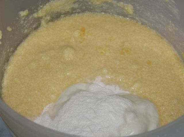 Потом добавляем сметану и разрыхлитель.