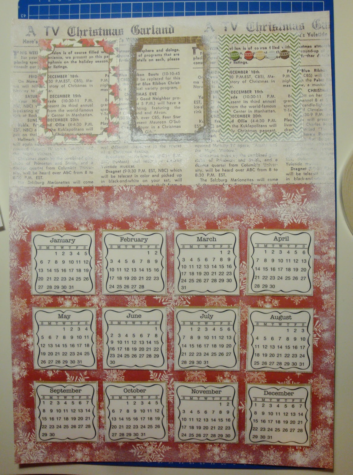 1. Начинаем нашу работу с разметки календарной сетки. Для этого отступаем от края бумаги по 2 см с каждой стороны. Далее в верхней части листа располагаем наши фотографии или как у меня рамки/подложки под них, в нижний части листа размечаем месяцы.