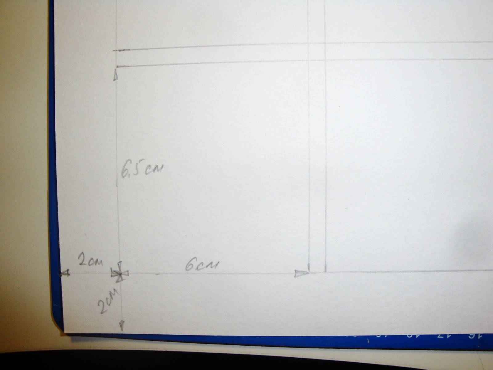 Замеряем наши прямоугольники с месяцами. У меня получились квадраты 5,7х5,7 см. Так как у меня по каждым месяцем будет кармашек с тэгом, то я отмеряю расстояние больше, чем сам месяц. Ширину я беру 6 см, а вот высоту 6,5 см - 0,5 см на торчащий тэг. Между месяцами делаем шаг в 0,5 см. Вот так это выглядит на бумаге: